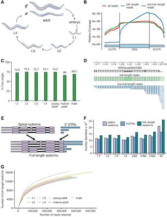 通過一系列的篩選標準,最終共計獲得2.9M 全長reads。綜合所有階段,最終鑒定到25,944 個全長轉錄本,其中20,987個轉錄本有唯一的可變剪接形式,16,325個轉錄本有唯一的3’UTRs ,平均每個階段鑒定到超過12,000條全長序列。在和線蟲數(shù)據(jù)庫進行注釋比對后,有12,613 轉錄本和10,711 個基因有全長數(shù)據(jù)支持,此外還鑒定到4,234個新基因和7,404 個新轉錄本。其中,發(fā)現(xiàn)9,900個已知可變剪接轉錄本和2,188個新的可變剪接轉錄本,對應1,349個基因。在這些新的剪接轉錄本中,有1,283個轉錄本在注釋的供體和受體剪接位點之間存在新的剪接位點,同時173個轉錄本還存在新的外顯子。