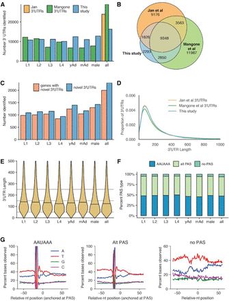 本文共鑒定到16,325個唯一的3’UTR轉錄本,在每個階段均鑒定到超過10,000 個3’UTRs。將鑒定到的3’?UTR與已知數(shù)據(jù)庫進行比對,發(fā)現(xiàn)共有82.9% UTRs的重疊。此外,還鑒定到2,304個新的發(fā)現(xiàn)的3’?UTR。3’?UTR的長度會隨著階段的延續(xù),從L1到L4,逐漸變短,在成年線蟲中,雄性線蟲的3’?UTR要短于雌雄同體的成蟲,而成蟲的 3’?UTR要稍長于L4階段的成蟲,這與前人的報道相反。通過不同階段多聚腺苷酸化位點統(tǒng)計,發(fā)現(xiàn)在不同階段,其位點不存在顯著差異,該結果表明,不同階段3’?UTR的長度分布與多聚腺苷化位點無關。