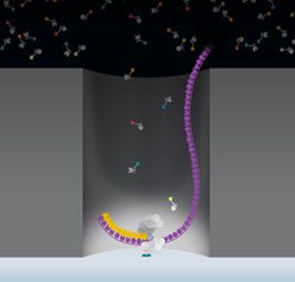 PB的測序空間為ZMW(zero-mode wave guides,零模波導(dǎo)孔),外徑100多納米,DNA分子掉入孔中,不同熒光標(biāo)記的脫氧核苷酸在聚合酶的作用下,會產(chǎn)生不同的熒光信號,隨后標(biāo)記基團(tuán)自動脫落,維持了信號的持續(xù)監(jiān)測。激光從ZMW底部打入,由于孔直徑很小而不能穿過孔進(jìn)入上方溶液區(qū),從而把背景噪音降到最低。