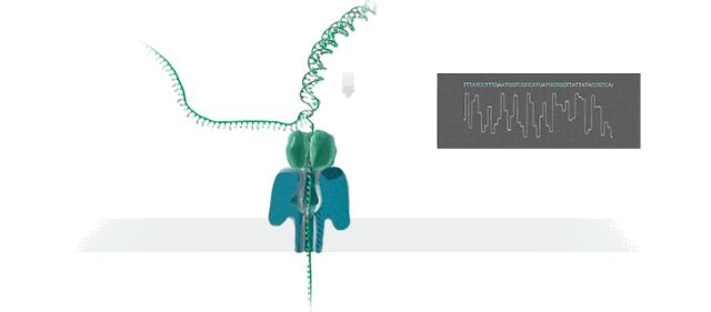 ONT測序?qū)⑷斯ず铣傻囊环N多聚合物的膜浸在離子溶液中,多聚合物膜上布滿了經(jīng)改造的穿膜孔的跨膜通道蛋白(納米孔),也就是Reader蛋白,在膜兩側(cè)施加不同的電壓產(chǎn)生電壓差,DNA鏈在馬達(dá)蛋白的牽引下,解螺旋通過納米孔蛋白,不同的堿基會形成特征性離子電流變化信號,通過對這些信號的檢測,得到堿基序列,完成測序。