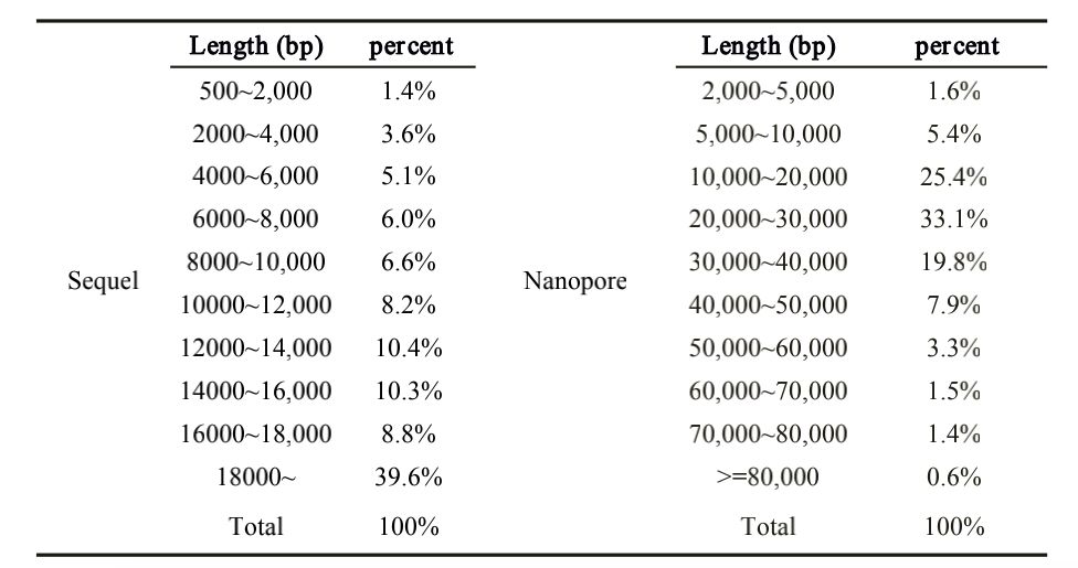 總結(jié):從這份數(shù)據(jù)可以看出,PB 平臺18K以上的數(shù)據(jù)占39.6%,Nanopore平臺20K以上的數(shù)據(jù)可達(dá)68%。