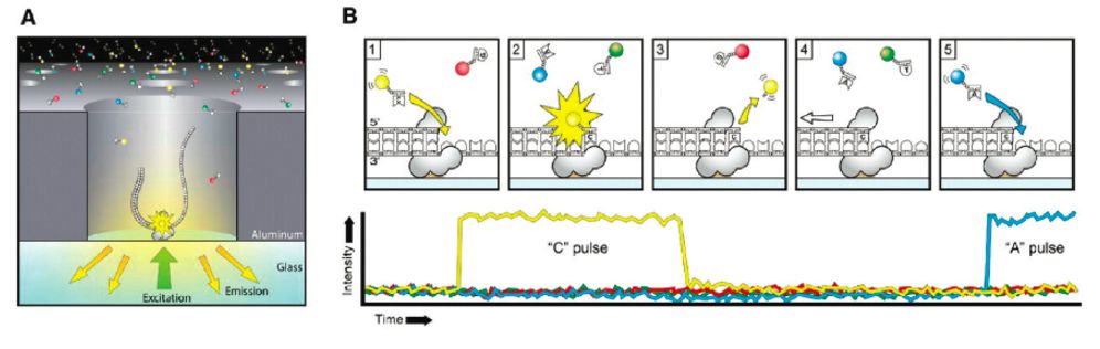 PacBio 提供的是一種邊合成邊測序的單分子實時測序技術(shù)。測序時,DNA聚合酶與模板鏈結(jié)合,在鏈合成的過程中,不同熒光標記的堿基會釋放不同的熒光信號,根據(jù)光的波長與峰值從而判斷堿基類型與順序。