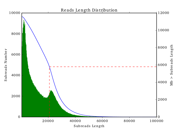 注:Subreads是產(chǎn)出的所有subreads數(shù)據(jù)集;Reads Num:reads數(shù)目;Total Bases (bp):堿基總數(shù);Reads N50 (bp):將reads從長到短排序,并依次相加,當加和等于總堿基數(shù)目一半時對應(yīng)的那條reads長度即為reads N50;Mean Length (bp):reads的平均長度;Longest Read (bp):最長read的長度。