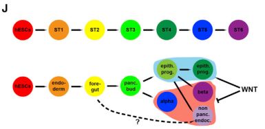體外分化方法的最終目標(biāo)是為糖尿病患者提供源自多能干細(xì)胞的β細(xì)胞而不是移植胰島。然而,應(yīng)該注意到,目前實(shí)施的醫(yī)療方案涉及全胰島移植,而不是單獨(dú)的β細(xì)胞。事實(shí)上,移植單細(xì)胞類型無法確定是否能夠重新獲得整個(gè)胰島的功能。因此,致力于在體外產(chǎn)生完整的胰島比純粹的β細(xì)胞群更有意義。文章嘗試在體外單細(xì)胞水平產(chǎn)生胰腺內(nèi)分泌細(xì)胞的方法。作者通過scRNA-seq產(chǎn)生了一個(gè)無偏的大數(shù)據(jù)集,這使得能夠表征所產(chǎn)生的各種細(xì)胞類型,它們的分化時(shí)間以及鑒定影響細(xì)胞命運(yùn)的分子途徑。長(zhǎng)遠(yuǎn)來看,精細(xì)調(diào)整祖細(xì)胞與內(nèi)分泌命運(yùn)的時(shí)間和平衡的能力可用于控制α和β細(xì)胞之間的比例,并促進(jìn)具有適當(dāng)細(xì)胞組成的胰島的體外形成。
