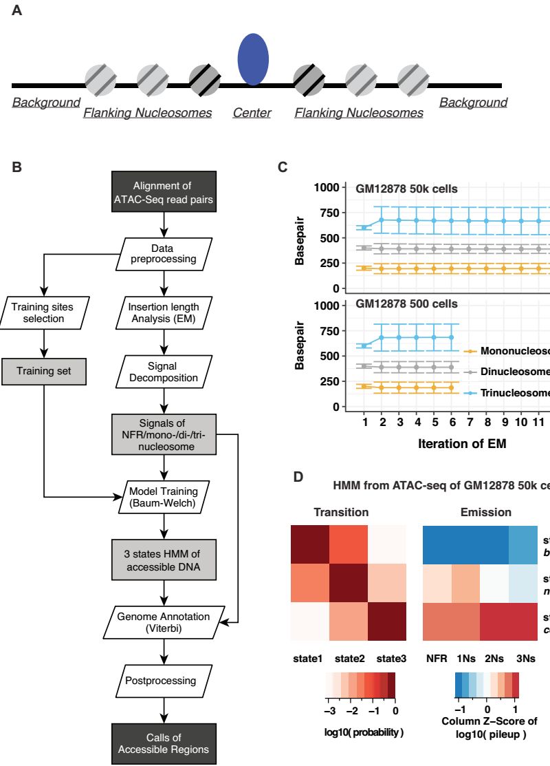 因此,作者提出了針對ATAC-seq數(shù)據(jù)的分析工具,HMMRATAC,一種基于半監(jiān)督機(jī)器學(xué)習(xí)方法。?HMMRATAC軟件的主要思想是decomposition and integration(分解和集成),首先將單個ATAC-seq數(shù)據(jù)集分成無核小體(nucleosome-free regions, NFR)和核小體富集信號,用隱馬爾科夫模型(HMM)訓(xùn)練開放區(qū)域周圍獨(dú)特的染色質(zhì)結(jié)構(gòu),然后預(yù)測整個基因組中的開放區(qū)域。?該方法利用了ATAC-seq數(shù)據(jù)的獨(dú)特特征來識別的染色質(zhì)的結(jié)構(gòu)更準(zhǔn)確。