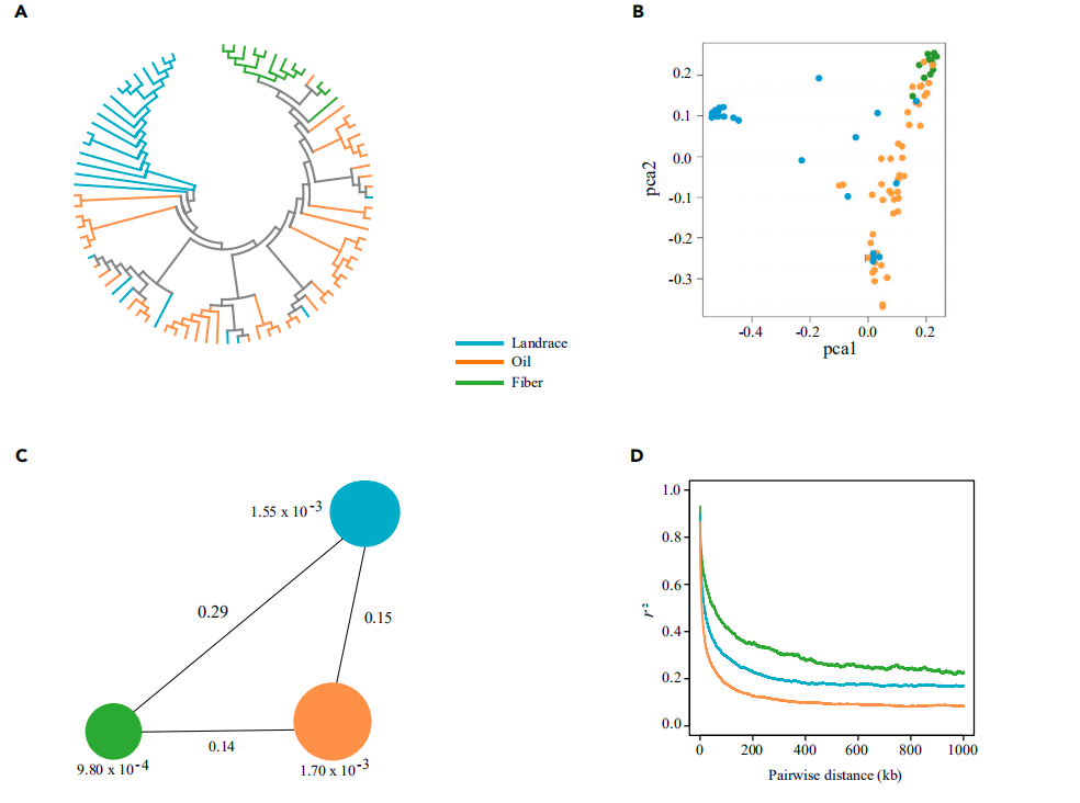 對83份亞麻材料個體重測序,共產(chǎn)生615 GB數(shù)據(jù),平均深度為11.2×,覆蓋率為97.4%,將測序數(shù)據(jù)與Longya-10基因組比對,共得到2,245,463個SNP和394,658個Indels。系統(tǒng)發(fā)育樹與群體結(jié)構(gòu)分析結(jié)果表明,83份亞麻材料分為三大類群,分別屬地方種、油用亞麻和纖維亞麻。油用亞麻與地方種的親緣關(guān)系較近,纖維亞麻的群體多樣性最低(π=9.80×10-4),且具有最長連鎖不平衡(LD)衰減距離(66.7Kb)。SMC++有效群體分析表明,亞麻經(jīng)歷了強(qiáng)烈的瓶頸效應(yīng)。