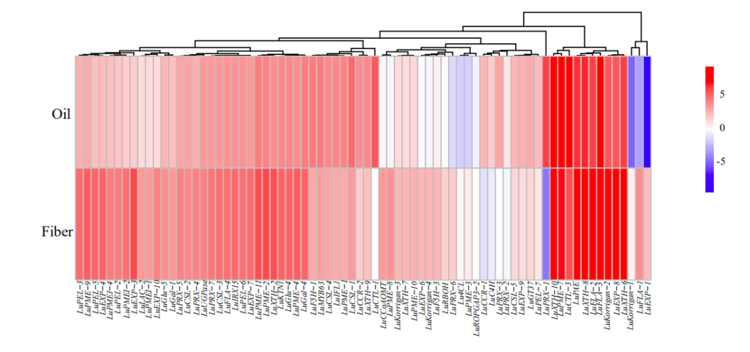 之前有報道纖維亞麻是從油用亞麻馴化而來,將油用亞麻與纖維亞麻進(jìn)行比較分析,存在47個選擇清除區(qū)域,其中50.9%與纖維亞麻相對于地方種的選擇區(qū)域重合。這表明在纖維用亞麻改良過程中,這些區(qū)域持續(xù)受到很強(qiáng)的選擇壓力。大約一半的基因(426/867個基因)僅在油用亞麻和纖維亞麻比較中發(fā)現(xiàn),包含內(nèi)切-β-1,4-葡聚糖酶(LuKorrigan)、果膠甲酯酶(LuPME)和焦磷酸銅合成酶(LuCPS)等。作者將選擇清除區(qū)域與之前報道的QTL/GWAS位點(diǎn)比較分析,發(fā)現(xiàn)2個硬脂酸相關(guān)的QTL與油用亞麻選擇區(qū)域重疊,一個株高相關(guān)的GWAS位點(diǎn)與纖維亞麻選擇區(qū)域重疊,另外3個油合成相關(guān)的QTL與纖維亞麻選擇區(qū)域重疊,這說明亞麻在馴化過程中受到雙重選擇。