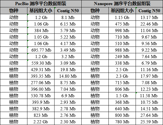 同時(shí)通過(guò)PacBio和Nanopore雙平臺(tái)測(cè)序數(shù)據(jù)組裝結(jié)果的比較發(fā)現(xiàn),利用PacBio數(shù)據(jù)進(jìn)行基因組組裝Contig N50一般達(dá)到Mb級(jí)別,而利用Nanopore數(shù)據(jù)進(jìn)行基因組組裝,Contig N50指標(biāo)平均水平基本能再提升2倍或者更高,甚至許多物種能達(dá)到幾十Mb(如百邁客利用Nanopore測(cè)序平臺(tái)組裝的水產(chǎn)動(dòng)物綠鰭?cǎi)R面鲀基因組,Contig N50高達(dá)22 Mb)。