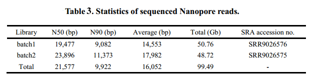 在對(duì)同源四倍體紫花苜蓿(Medicago sativa?L.)基因研究中,首先利用了70 GB,~22x PacBio CCS數(shù)據(jù)進(jìn)行基因組組裝,組裝獲得紫花苜?;蚪M大小3154 Mb,Contig N50=459 kb, 然后利用ALLHiC進(jìn)行同源染色體組群的劃分,最后通過(guò)Hi-C互作熱圖、遺傳圖譜共線性、ONT數(shù)據(jù)回比、BUSCO完整性、轉(zhuǎn)錄組對(duì)基因組完整性等進(jìn)行評(píng)估,值得注意的是在ONT數(shù)據(jù)回比評(píng)估中(Table 3),文中篩選了99 GB ONT long reads中的最長(zhǎng)200條reads(ranged from 95 to 263 Kb)進(jìn)行回比,發(fā)現(xiàn)89%的的reads都能比對(duì)到single染色體上,結(jié)合其它評(píng)估方法,進(jìn)一步說(shuō)明了組裝及染色體位置的準(zhǔn)確性。