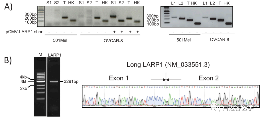 3、特異性引物擴(kuò)增及sanger測(cè)序驗(yàn)證SI-LARP1和LI-LARP1 isoform表達(dá)情況:501-MEL(黑色素瘤細(xì)胞系)和OVCAR-8細(xì)胞中只表達(dá)LI-LARP1;