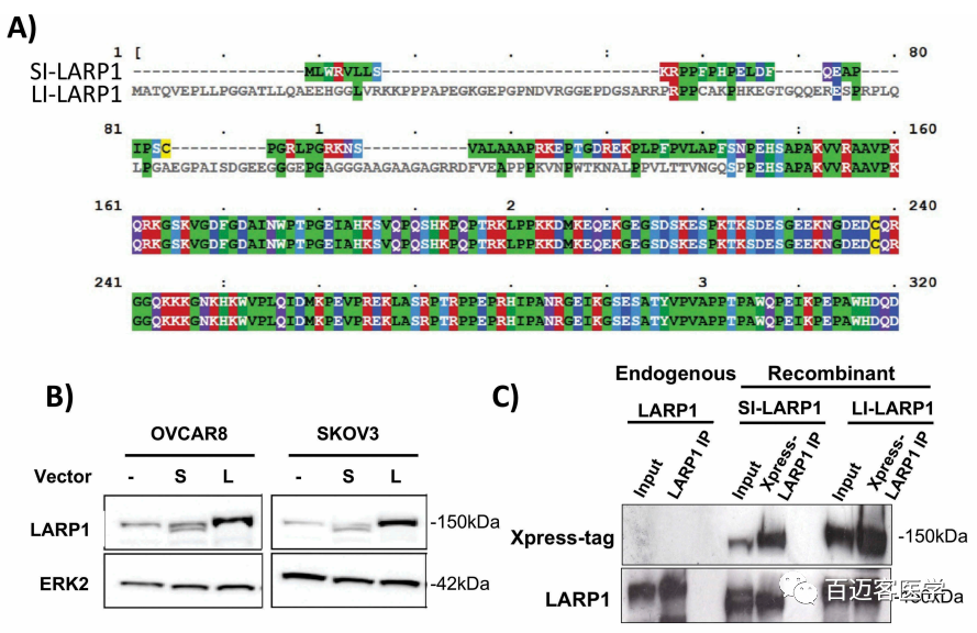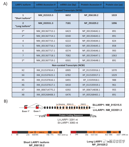 圖1A為NCBI基因數(shù)據(jù)庫(kù)中列出的9種不同的LARP1經(jīng)驗(yàn)證的isoform。LARP1典型轉(zhuǎn)錄本為NM_015315.5,編碼1019個(gè)氨基酸(NP_056130.2)的蛋白質(zhì),在此處稱為“ SI-LARP1”。UniProtKB數(shù)據(jù)庫(kù)引用了另一個(gè)比較長(zhǎng)的轉(zhuǎn)錄本NM_033551.3作為L(zhǎng)ARP1的規(guī)范形式,它對(duì)應(yīng)于1096個(gè)氨基酸蛋白(NP_291029.2),在此稱為“LI-LARP1” 。SI-LARP1蛋白與LI-LARP1不同,它缺少前77個(gè)氨基酸,并且氨基酸M1至N67不同。