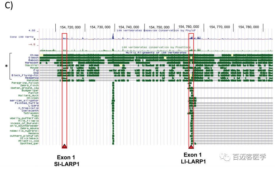 接下來(lái),作者對(duì)SI-LARP1是否可以發(fā)揮獨(dú)特的功能作用感興趣。為此分析了2種LARP1亞型的TSS區(qū)保守水平(圖5C)。作者假設(shè),進(jìn)化保守將暗示選擇性壓力,因此每種亞型的作用不同。為了解釋LARP1亞型的進(jìn)化保守性,使用UCSC基因組瀏覽器在脊椎動(dòng)物(鳥類、魚類、兩棲動(dòng)物、爬行動(dòng)物、哺乳動(dòng)物)亞門上生成了100個(gè)可用LARP1序列的多序列比對(duì)。出乎意料的是,LI-LARP1外顯子1在整個(gè)亞科中都具有很強(qiáng)的保守性,但SI-LARP1外顯子1的保守性僅存在于胎盤動(dòng)物分支中,其中包括人類和其他靈長(zhǎng)類動(dòng)物。這表明它可能在胎盤哺乳動(dòng)物的進(jìn)化晚期獲得了功能性作用。相比之下,LI-LARP1的保守性跨多個(gè)進(jìn)化分支表明作用更為古老。