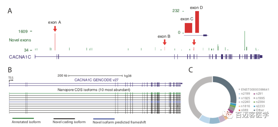 在CACNA1C基因座內(nèi)總共注釋了39個(gè)潛在的新外顯子,其中38個(gè)在至少2個(gè)人或組織中被識(shí)別,并在每個(gè)文庫(kù)中得到至少5條nanopore reads的支持(圖2A)。通過PCR和Sanger測(cè)序確認(rèn)了新的外顯子與其周圍的注釋外顯子之間的剪接連接,從而驗(yàn)證了四個(gè)新的外顯子。這種新的外顯子的成功驗(yàn)證提供了很高的可信度,即通過納米孔測(cè)序鑒定的新的外顯子是真實(shí)的,并且被整合到CACNA1C轉(zhuǎn)錄本中。表達(dá)量最高的10條轉(zhuǎn)錄本中,有9條是新的且其中有8條被預(yù)測(cè)保持CACNA1C閱讀框架,這表明這些最豐富的新轉(zhuǎn)錄本中有一些編碼功能不同的蛋白質(zhì)異構(gòu)體(圖2B,C)。這些結(jié)果表明,新的CACNA1C轉(zhuǎn)錄本表達(dá)豐富,數(shù)量也很多,目前的注釋缺少許多最豐富的CACNA1C轉(zhuǎn)錄本。