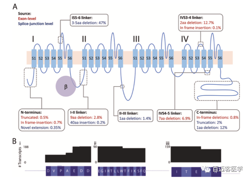 CACNA1C編碼CaV1.2 的主要成孔亞基。鈣孔由24個(gè)跨膜重復(fù)序列組成,由細(xì)胞內(nèi)環(huán)連接成4個(gè)結(jié)構(gòu)域(I-IV)(圖4A)。在我們鑒定的83個(gè)新的外顯子水平的轉(zhuǎn)錄本中,51個(gè)可能編碼功能性的CaV1.2通道?;疑娇虮硎拘碌?、框架內(nèi)的插入和刪除的位置(值表示包含每個(gè)isoforms的reads的平均比例)。使用兩種分析方法(外顯子水平和剪切連接水平)鑒定變體的情況,外顯子水平計(jì)數(shù)用于得出豐度(紅色文本);僅使用剪接位點(diǎn)水平方法鑒定的變體用藍(lán)色文本表示。包含三個(gè)微缺失的蛋白質(zhì)異構(gòu)體的數(shù)量:(I)在I-II接頭中,(Ii)在IV4-5接頭中,以及(Iii)在IV3-4接頭中先前報(bào)道的微缺失(圖4B)。