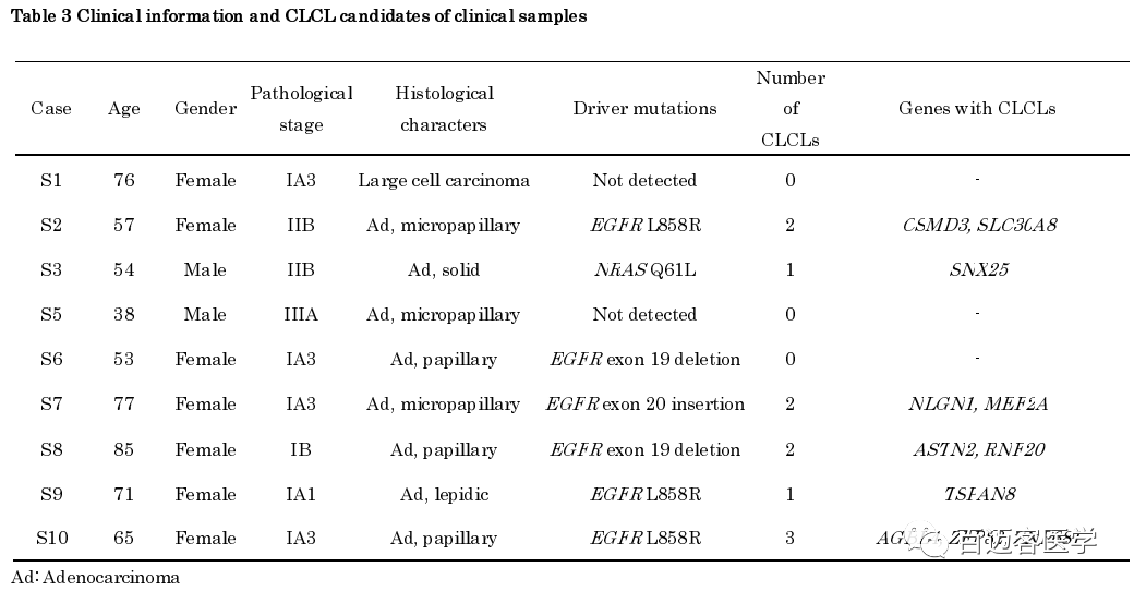 為了檢查臨床肺癌肺腺癌病例中是否也存在CLCL,對9名日本肺腺癌患者的手術(shù)標本進行了類似的PromethION全基因組測序(表3)。表3中顯示了每個患者所檢測到的驅(qū)動基因突變。平均每個case生成了43,953,136,203 bp的序列(深度大于10倍)。對于S10病例,還對正常組織標本進行了測序,以消除可能的正常組織變異和源自比對錯誤的可疑CLCL。