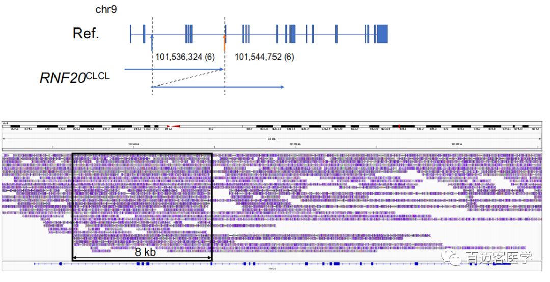 再次成功檢測到CLCL,9個樣本中有6個在其腫瘤基因組中至少包含一個CLCL,包括幾個關(guān)鍵的癌癥基因。例如,在病例S8中,確定了RNF20 CLCL。該患者為女性患者,已被證明具有EGFR外顯子19缺失作為驅(qū)動突變。但是,其他癌癥突變?nèi)匀浑y以捉摸。RNF20基因的CLCL為內(nèi)含子2(chr9:101,536,324)和內(nèi)含子6(chr9:101,544,752)之間的串聯(lián)重復,這很可能導致該基因的功能喪失。RNF20基因編碼具有抑癌功能的E3泛素連接酶,并且經(jīng)常發(fā)生突變,特別是在肺癌中。表3總結(jié)了獲得患者致癌作用的分子病因?qū)W指征。需要進一步擴展長讀長測序序列,以更√確地識別CLCL的頻率和CLCL偏好的基因。