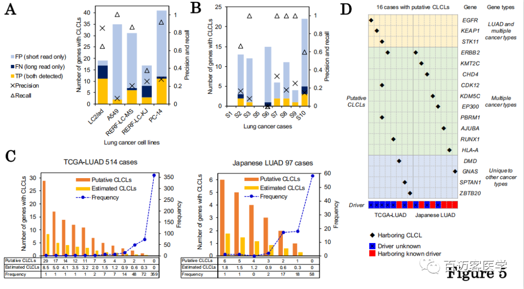 盡管對于所有細胞系和臨床樣品,使用短讀長數(shù)據(jù)分別估計21%和72%的CLCL檢測z確度和重復檢出率,但將構(gòu)建的分析流程應(yīng)用于514個 TCGA肺腺癌(TCGA-LUAD)和97個日本肺腺癌(Japanese LUAD)樣本全外顯子組測序數(shù)據(jù),通過分別從TCGA-LUAD和日本LUAD病例中進行軟切割reads分析,共檢測到269個和50個具有串聯(lián)重復結(jié)構(gòu)的連接點,這些結(jié)構(gòu)可能對應(yīng)于CLCL(每個病例1至29個基因)。總計從155(30%)TCGA-LUAD和39(40%)日本LUAD病例中提取了候選CLCL(圖5C)。