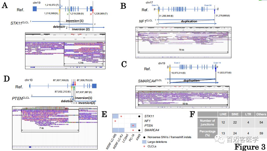 在其他細胞系中也成功鑒定出以下數(shù)量的CLCL:LC2/ad中有16個,A549中有1個,RERF-LC-KJ中有7個,RELF-LC-MS中有7個,PC-14中有11個。重要的是,CLCLs甚至出現(xiàn)在關(guān)鍵的癌癥基因中,例如STK11,NF1,SMARCA4和PTEN基因。異常的結(jié)構(gòu)各不相同,并且由于其復雜的結(jié)構(gòu)和受累區(qū)域的大小,傳統(tǒng)的基于短讀長測序分析的方法不易檢測到它們中的大多數(shù)。相對簡單的一種是在RERF-LC-MS細胞的NF1基因中檢測到的(圖3B),內(nèi)含子9(chr17:31,200,948)和最后一個外顯子36的下游區(qū)域(chr17:31,278,880;在交界處有6條reads支持)之間的串聯(lián)串聯(lián)重復。在另一種情況下,SMARCA4 CLCL的結(jié)構(gòu)顯示出從內(nèi)含子1(chr19:10,973,314)到內(nèi)含子20(chr19:11,022,573;在交界處有8條reads支持;圖3C)。在PC-14中的PTEN結(jié)構(gòu)中發(fā)現(xiàn)了更復雜的情況,該CLCL是倒位和缺失的組合(圖3D)。在這些相對簡單的情況下,將Illumina短reads重新映射到已發(fā)現(xiàn)的junction位點可驗證重建結(jié)構(gòu)的√確識別。
