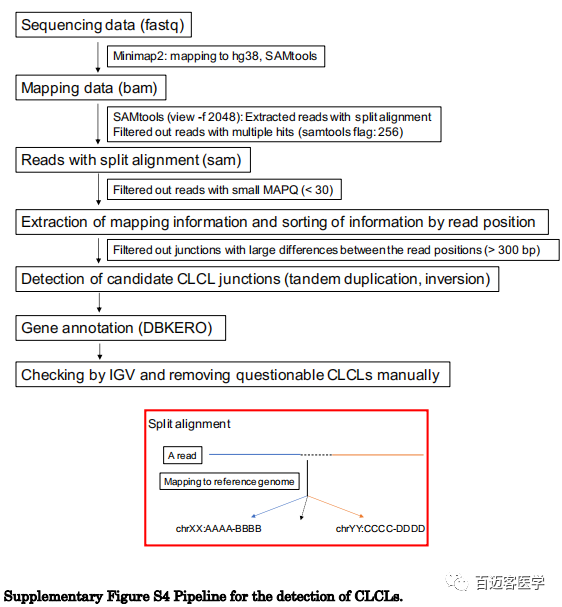 為了更普遍地識別所有肺癌細胞系其他基因座中的CLCL,作者構(gòu)建了一條新的分析性生物信息學流程。簡而言之,利用了來自比對結(jié)果的split比對信息,根據(jù)reads位置對比對信息進行排序,并提取了候選CLCL。相關(guān)的reads被重組以重建其結(jié)構(gòu)。