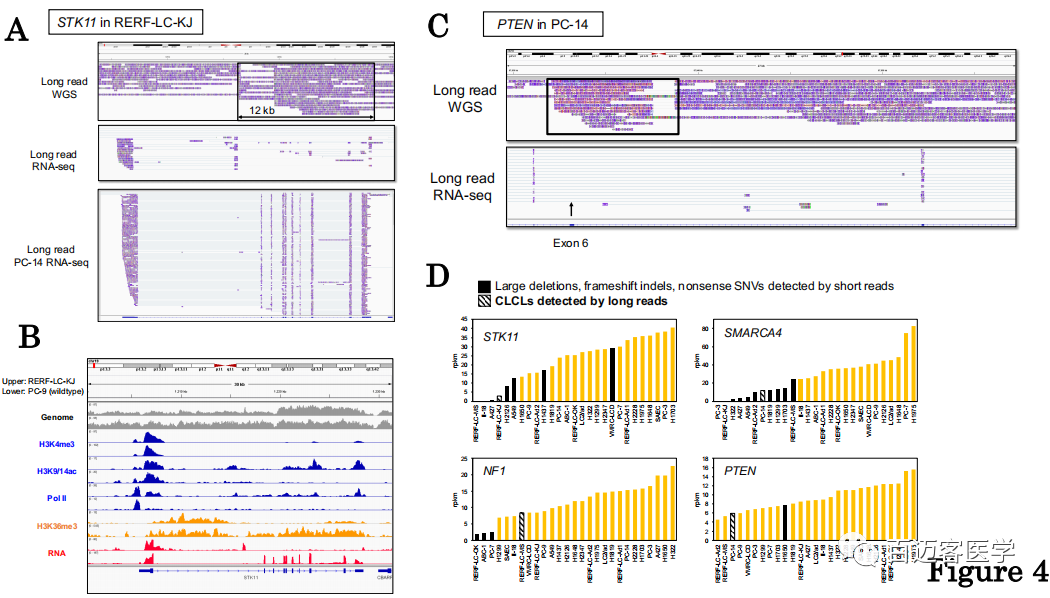 我們對其他CLCL進行了類似的分析,對于PC-14中的PTEN基因(圖4C),CLCL位于外顯子6。結(jié)果,該外顯子完全跳躍。因此,所得的轉(zhuǎn)錄本應(yīng)移碼,可能導致PTEN基因的功能喪失。根據(jù)Illumina RNA-seq數(shù)據(jù)檢查了包含CLCL的STK11,NF1,SMARCA4和PTEN基因中的RNA表達水平。結(jié)果表明,CLCL通??赡軐е禄虮磉_水平降低(圖4D)。但是,在某些情況下,基因表達水平仍然很顯著,例如RERF-LC-MS細胞中的NF1轉(zhuǎn)錄本和PC-14細胞中的PTEN轉(zhuǎn)錄本。