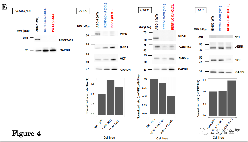 為了解決CLCL的生物學意義,作者研究了受CLCL影響的基因座如何引起蛋白質(zhì)表達水平及其相關(guān)信號通路變化。蛋白質(zhì)印跡WB分析發(fā)現(xiàn)STK11,NF1,SMARCA4和PTEN的蛋白質(zhì)在這些基因中帶有CLCL的細胞中完全丟失了(圖4E)。進一步檢查了下游蛋白的激活狀態(tài),在所有檢查的case中均觀察到了預期的信號通路破壞。磷酸化的AKT(phospho-AKT)相應(yīng)地激活mTOR信號通路,而PTEN抑制AKT的磷酸化。觀察到phospho-AKT異常上調(diào),反映了PC-14細胞(PTEN-CLCL)中PTEN的功能喪失。AMPK是在維持細胞動態(tài)平衡中起重要作用的基因,AMPK蛋白在其α亞基處的磷酸化被STK11激活。在RERF-LC-KJ細胞(STK11-CLCL)中,其激活受到損害。NF1基因是RAS的負調(diào)控因子,位于RAS信號通路下游的磷酸化ERK在RERF-LC-MS細胞(NF1-CLCL)中異常上調(diào)。無論是由于常規(guī)畸變還是CLCL,相應(yīng)基因的蛋白質(zhì)明顯丟失,但其后果仍會根據(jù)情況而有所不同。例如,即使STK11蛋白在RERF-LC-MS細胞(STK11缺失)和RERF-LC-KJ細胞(STK11-CLCL)中類似地消失,在RERF-LC-KJ細胞(STK11-CLCL)中磷酸-AMPKα的增強比例也更高。RERF-LC-OK(NF1-缺失)細胞系中NF1蛋白影響幾乎無法檢測到,而對RERF-LC-MS細胞(NF1-CLCL)的影響卻很明顯。表明,其他途徑有時可以彌補關(guān)鍵蛋白的缺失。
