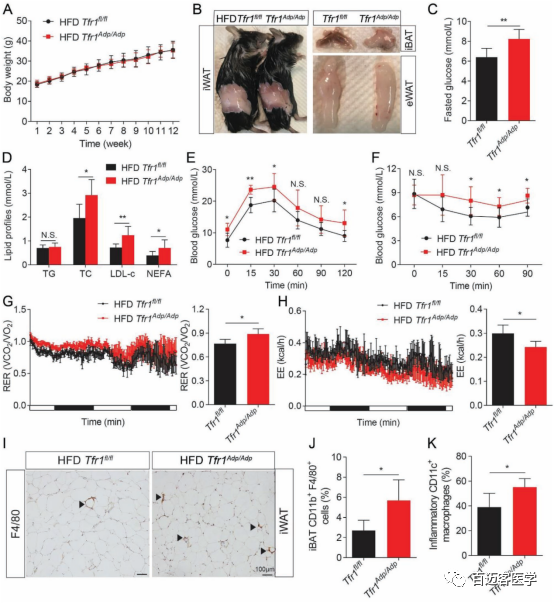 為了進(jìn)一步探究Tfr1基因在棕色/米色脂肪細(xì)胞的發(fā)育和產(chǎn)熱能力維持的過(guò)程的作用機(jī)制。分別對(duì)Tfr1Adp/Adp和Tfr1fl/fl 進(jìn)行高脂肪、正常喂養(yǎng),并對(duì)4組樣本分別進(jìn)行葡萄糖耐量、胰島素抵抗、呼吸速率、能量消耗、CD11b+F4/80巨噬細(xì)胞、CD11c+巨噬細(xì)胞的比例等實(shí)驗(yàn)。數(shù)據(jù)表明在高脂肪處理實(shí)驗(yàn)組 中,整體體重(Fig3 A)、白色脂肪組織(Fig3 B)大小都沒(méi)有明顯的差異。然而在高脂實(shí)驗(yàn)組中棕色脂肪組織完全轉(zhuǎn)化為白色脂肪組織(Fig3 B)。同時(shí)小鼠空腹血糖、血脂、非酯化脂肪酸脂肪酸的含量明顯高于高脂對(duì)照組。高脂喂養(yǎng)后,盡管血液中血糖含量沒(méi)有太大的變化,但是驗(yàn)組中葡萄糖耐量、胰島素抵抗的值都要高于高脂對(duì)照組(Fig3E/F)。這說(shuō)明高脂實(shí)驗(yàn)組中糖耐受性受損可能是導(dǎo)致空腹血糖升高的原因。而呼吸速率、能量消耗的實(shí)驗(yàn)表明缺失Tfr1基因后呼吸速率會(huì)增加,能量消耗能力降低(Fig3G/H)。在正常喂養(yǎng)的實(shí)驗(yàn)組中白色脂肪組織相對(duì)于正常對(duì)照組來(lái)說(shuō)明顯減少。 上述數(shù)據(jù)表明,能量消耗降低并沒(méi)有導(dǎo)致高脂喂養(yǎng)實(shí)驗(yàn)組小鼠體重增加,可能是由于Tfr1缺失對(duì)白色脂肪細(xì)胞的內(nèi)在的影響。