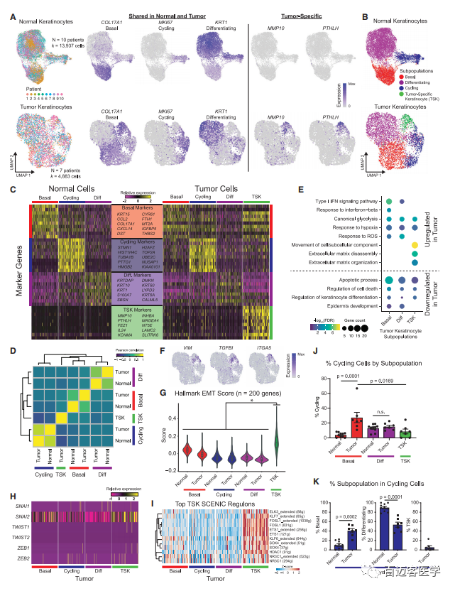 重新聚類(lèi)正常上皮細(xì)胞后,在正常皮膚中觀察到3個(gè)主要的角質(zhì)細(xì)胞(KC)亞群(基底、循環(huán)、分化細(xì)胞)。典型相關(guān)分析表明腫瘤KCs廣泛重現(xiàn)了正常(基底、循環(huán)、分化細(xì)胞)亞群,在正常皮膚和cSCC中有幾個(gè)共享的標(biāo)記基因(圖2A-D)。有趣的是,在腫瘤細(xì)胞聚類(lèi)中出現(xiàn)了與正常皮膚無(wú)明顯關(guān)聯(lián)的第四個(gè)KC亞群,即TSK亞群(圖2B-D)。事實(shí)上,在這一簇與其他腫瘤細(xì)胞區(qū)別開(kāi)來(lái)的100個(gè)基因中,有99個(gè)基因在腫瘤組織中的表達(dá)明顯高于正常組織。TSK標(biāo)記基因與細(xì)胞運(yùn)動(dòng)和細(xì)胞外基質(zhì)分解有關(guān),暗示了它的侵入性(圖2E)。TSKs表達(dá)經(jīng)典的上皮-間質(zhì)轉(zhuǎn)化(EMT)標(biāo)志物,如VIM和ITGA5(圖2F);但是EMT類(lèi)似的TSK細(xì)胞缺乏經(jīng)典表達(dá)EMT轉(zhuǎn)錄因子(圖2H)。因此,我們通過(guò)單細(xì)胞調(diào)控網(wǎng)絡(luò)進(jìn)行推理和聚類(lèi),提名AP1和ETS家族成員為潛在控制TSKs的TFs(圖2I)。TSK細(xì)胞也表現(xiàn)出較大的EMT評(píng)分范圍,提示細(xì)胞狀態(tài)具備高可塑性(圖2G),與EMT連續(xù)模型一致?;准?xì)胞(Basal)在腫瘤中的發(fā)生率約是正常循環(huán)細(xì)胞的四倍(圖2K)。總的來(lái)說(shuō),cSCC表現(xiàn)出分化失常,基底細(xì)胞迅速增殖,并出現(xiàn)表達(dá)EMT連鎖基因的TSK亞群。