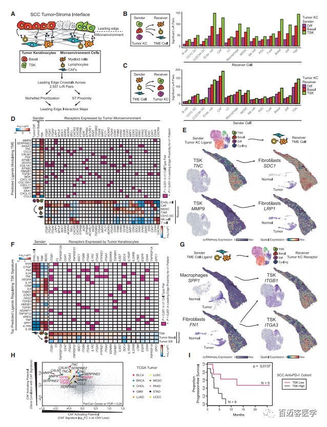 進(jìn)一步,我們整合scRNA-seq和ST數(shù)據(jù)來(lái)描述前沿鄰近腫瘤和TME細(xì)胞之間的信號(hào)通路(圖6A)。基于配體-受體對(duì)數(shù)據(jù)庫(kù),TSKs廣參與了自分泌和旁分泌相互作用(主要與CAFs、內(nèi)皮細(xì)胞、巨噬細(xì)胞和MDSCs)(圖6B&C)。我們使用NicheNet和ST對(duì)前沿預(yù)測(cè)為調(diào)節(jié)TME特異性細(xì)胞類(lèi)型標(biāo)記的腫瘤KC配體進(jìn)行優(yōu)先排序。與TSK-纖維血管生態(tài)位一致的是,對(duì)CAFs的顯著TSK信號(hào)通路是由幾對(duì)TSK-CAF配體-受體對(duì)介導(dǎo)的,包括MMP9-LRP1和TNC-SDC1(圖6D&E)。此外,TSKs可通過(guò)配體-受體對(duì)(PGF-FLT1、PGF-NRP2和EFNB1-EPHB4)調(diào)節(jié)內(nèi)皮細(xì)胞。相反地,內(nèi)皮細(xì)胞和CAFs顯著共表達(dá)NicheNet預(yù)測(cè)配體,如TFPI, FN1,和THBS1,這些與TSK受體匹配(圖6F&G)。進(jìn)一步證實(shí)TSKs是一種類(lèi)似EMT的群體。為了判定TSK細(xì)胞是否與多變的TME普遍關(guān)聯(lián),我們調(diào)研了TCGA數(shù)據(jù)庫(kù)中31種實(shí)體瘤數(shù)千個(gè)轉(zhuǎn)錄組數(shù)據(jù)。我們進(jìn)一步判定TSK配體是否誘導(dǎo)CAF基因(1)伴隨配體CNV缺失,減少CAF基因表達(dá);(2)配體表達(dá)和CAF基因的關(guān)聯(lián)(圖6H),這個(gè)在過(guò)往研究中被證實(shí)。另外TSK細(xì)胞可以抑制抗腫瘤免疫。雖然這些研究還不明確TSK細(xì)胞是內(nèi)在抵抗還是免疫調(diào)節(jié)活性起作用,但這個(gè)亞群提供了一個(gè)提高免疫治療的目標(biāo)方向。