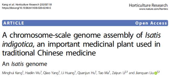 2020年2 月1日,四川大學(xué)生命科學(xué)學(xué)院劉建全課題組與華中農(nóng)業(yè)大學(xué)作物遺傳改良國家重點(diǎn)實(shí)驗(yàn)室李再云課題組首次完成了菘藍(lán)(Isatis indigotica,2n=14)染色體級(jí)別基因組圖譜繪制。該研究利用Pacbio測(cè)序(140X)結(jié)合北京百邁客生物技術(shù)有限公司的Hi-C技術(shù)(284X)組裝得到294Mb高質(zhì)量基因組(contigN50=1.2Mb)?;谕此阉骱凸δ茏⑨?,確定了該物種主要化合物(如吲哚類、萜類、黃酮、木脂素等物質(zhì))的可能生物合成通路和相關(guān)的候選基因。該研究強(qiáng)調(diào)了基因組測(cè)序在鑒定藥用植物代謝產(chǎn)物合成候選基因中的重要性,為今后十字花科植物比較基因組等研究提供了重要遺傳信息。