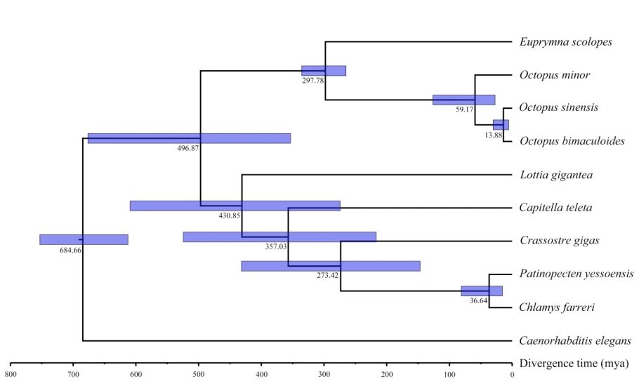 比較基因組學(xué)分析發(fā)現(xiàn)預(yù)測(cè)到的31676個(gè)基因中有24698個(gè)基因可被聚類到17020個(gè)基因家族。其中有741個(gè)基因家族為10個(gè)物種共有,包含有10653個(gè)同源基因。利用10個(gè)物種的238個(gè)單拷貝同源基因構(gòu)建進(jìn)化樹,結(jié)果表明長(zhǎng)蛸的分化時(shí)間早于中國真蛸和加州雙斑蛸,而中國真蛸與加州雙斑蛸關(guān)系更近,其分化時(shí)間約為13.88 Mya(圖3)。