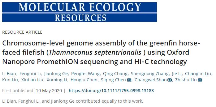 2020年5月,中國水產(chǎn)科學(xué)研究院黃海水產(chǎn)研究所陳四清研究員團(tuán)隊(duì)與北京百邁客生物科技有限公司合作完成了超高質(zhì)量的綠鰭馬面鲀基因組,相關(guān)研究成果發(fā)表在知名期刊Molecular Ecology Resources上。本次研究基于納米孔測(cè)序技術(shù)(Nanopore)和染色體構(gòu)象捕獲技術(shù)(Hi-C)完成的基因組僅包含242個(gè)Contigs,Contig N50高達(dá)22.46 Mb,并將99.44%序列掛載到20條染色體上,實(shí)現(xiàn)了海洋魚類基因組組裝質(zhì)量質(zhì)的飛躍。