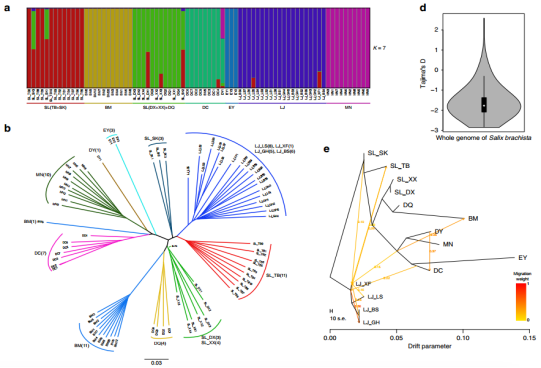 研究結(jié)果1:小墊柳具有顯著的種群分化,盡管其具有長(zhǎng)距離傳播的能力,但種群間的基因流微弱;小墊柳自晚中新世以來(lái)的群體波動(dòng)與劇烈的氣候波動(dòng)耦合,天空島效應(yīng)、多樣而異質(zhì)的生境和氣候波動(dòng)可能是驅(qū)動(dòng)小墊柳種內(nèi)群體分化的重要因素;