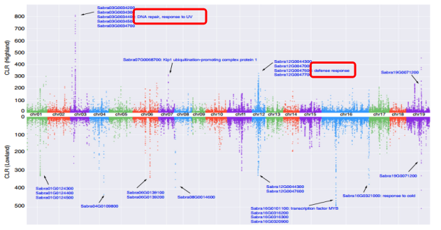 研究結(jié)果2:自然選擇在小墊柳高、低海拔群體中的作用區(qū)域和強(qiáng)度都具有顯著的差異,說(shuō)明分布于橫斷山區(qū)海拔高差大、生境多樣而異質(zhì)的物種可能在自然選擇的作用下發(fā)生種下的種群分化(Sabra3G0034400DNA修復(fù),Sabra12G0047600細(xì)菌防御應(yīng)答,Sabra16G0101100細(xì)胞對(duì)DNA損傷刺激的應(yīng)答和對(duì)寒冷的應(yīng)答)。
