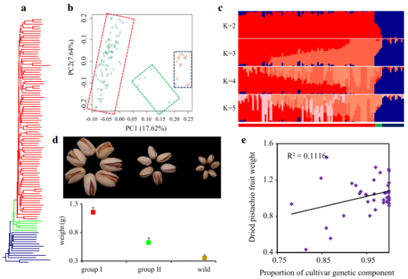 研究結(jié)果1:揭示了開(kāi)心果的兩步馴化過(guò)程(栽培種質(zhì)分為兩個(gè)群。栽培種Group I的LD值最高,栽培種Group II和野生開(kāi)心果的LD衰減值相近。Group II包括 Qazvini,Italiaei和Badami Zarand在內(nèi)的5種類型的個(gè)體,且這些種質(zhì)被記錄為古代具有種子的材料);