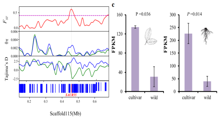 研究結(jié)果2:在開(kāi)心果中,基因組上約有 9.2 Mb 的區(qū)域被鑒定為具有高水平的群體分化,包含665個(gè)基因,其中開(kāi)心果株型可能與 SAUR55 基因的選擇相關(guān),同時(shí)該基因 表現(xiàn)出了顯著增加的表達(dá)水平;果實(shí)重量的變化發(fā)生在馴化與人工選擇期間(CYCD7-1基因)。