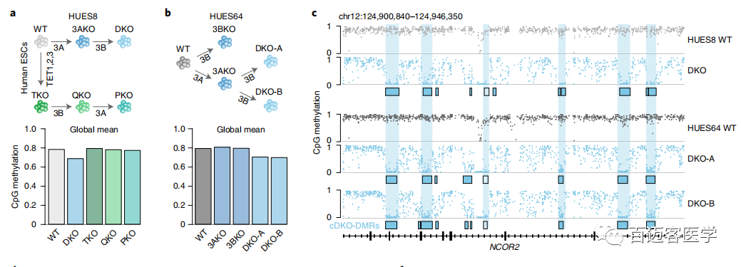 尚無研究直接比較喪失所有去甲基酶和甲基轉(zhuǎn)移酶化對轉(zhuǎn)錄和基因組調(diào)控以及細(xì)胞活性的影響。為了檢查去除所有DNA甲基化活性調(diào)節(jié)蛋白的分子后果,作者生成了在DNMT3A和-3B以及所有3個TET蛋白均缺失的五元敲除( pentuple-knockout,PKO)人類ESC進行相關(guān)研究。
