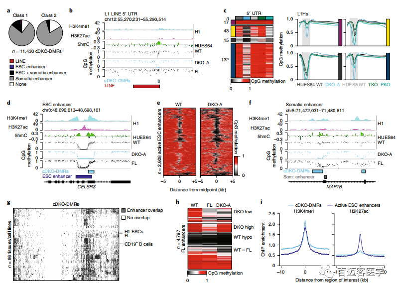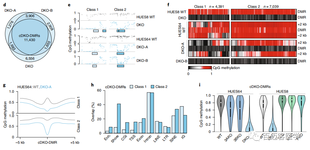 為了進一步研究這種甲基化缺失,接下來從另一個人類ESC系(HUES64)(包括2個獨立的DKO克隆(A和B))WT和DKO細(xì)胞進行了甲基化測序,并將甲基化水平與先前衍生的18個單DNMT3A-/-(3AKO)和單DNMT3B-/-(3BKO)敲除數(shù)據(jù)作比較(圖1b)。兩種不同的雄性WT ESC似乎具有可比性,具有相似的整體甲基化平均值(HUES64,0.79;HUES8,0.78),并且在1kb分辨率上具有較高的相關(guān)性(Pearson系數(shù)=0.93)。有趣的是,盡管第22代的單DNMT3基因敲除仍保持高度甲基化(3AKO,0.81;3BKO,0.79),但2個HUES64 DKO克隆僅經(jīng)過3代后甲基化降低至0.70(圖1b)。當(dāng)我們以堿基對的分辨率檢查數(shù)據(jù)時,觀察到2個不同的動態(tài)類別:0.1-0.2的細(xì)微下降,影響了整個基因組范圍內(nèi)約10%的CpG,以及,在CpG島內(nèi)局部發(fā)生的甲基化幾乎完全喪失的CpG位點(圖1c)。使用嚴(yán)格的標(biāo)準(zhǔn)(甲基化差異> 0.6,P <0.01,F(xiàn)檢驗)來定義差異甲基化區(qū)域(DMR)。DKO-DMR在3個DKO譜系上都非常一致(圖1c,d)。因此,定義了在所有3個樣品中均被甲基化的“一致性”的11,430個cDKO-DMR,cDKO-DMR始終保持較低水平(平均WT,0.749;DKO,0.086),平均長度為688個堿基對(bp)。WT ESC中大約三分之一cDKO-DMR鄰近低甲基化區(qū)域,例如CpG島和轉(zhuǎn)錄起始位點(稱為“1類”),而其余的cDKO-DMR則位于其他高度甲基化的區(qū)域(內(nèi)含子或基因間),具有明顯的高甲基化邊界(稱為“第2類”;圖1e–h)。幾乎所有的cDKO-DMR(93%)都被DNMT3A或-3B甲基化,僅在DKO中被完全去甲基。