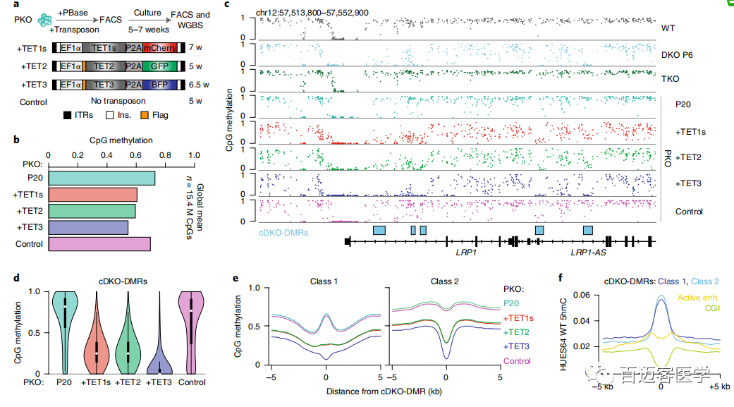 為了驗證cDKO-DMR是否依賴并持續(xù)誘導(dǎo)TET活性,利用PiggyBac轉(zhuǎn)座將外源TET1(短isoform簡稱TET1s)、TET2和TET3重新引入PKO細(xì)胞中,并使用WGBS測量了總體甲基化水平(圖2a)。在異位表達(dá)每種蛋白質(zhì)后,PKO細(xì)胞的總體平均甲基化水平從第20代的0.73明顯降低到了異位表達(dá)每種蛋白質(zhì)后的0.61、0.59和0.54,而僅用轉(zhuǎn)座酶轉(zhuǎn)染的對照細(xì)胞保持穩(wěn)定(平均值=0.70;圖2b)。重新引入任何TET酶可在很大程度上恢復(fù)TKO細(xì)胞中異常高甲基化的區(qū)域,誘導(dǎo)快速的cDKO-DMR去甲基化(圖2c-e)。從機理的角度來看,TET1s亞型缺乏CXXC結(jié)構(gòu)域,無法募集至未甲基化的CpG密集區(qū)域,但TET1和TET2 rescue結(jié)果之間無明顯差異,支持了CXXC結(jié)構(gòu)域無關(guān)的募集機制。TET及其作用相反的酶在cDKO-DMRs上的持續(xù)動態(tài)也得到了已發(fā)表的染色質(zhì)免疫沉淀的支持,隨后進行ChIP-seq,該數(shù)據(jù)表明WT ESC中DNMT3B和TET1均富集,盡管富集在比相當(dāng)狹窄且定義明確的cDKO-DMR邊界更寬區(qū)域。最后,進行了全基因組氧化亞硫酸氫鹽測序(oxBS),并在WT細(xì)胞中發(fā)現(xiàn)了5hmC的顯著局部富集(平均cDKO-DMRs,0.07;背景,0.01;圖2f)。
