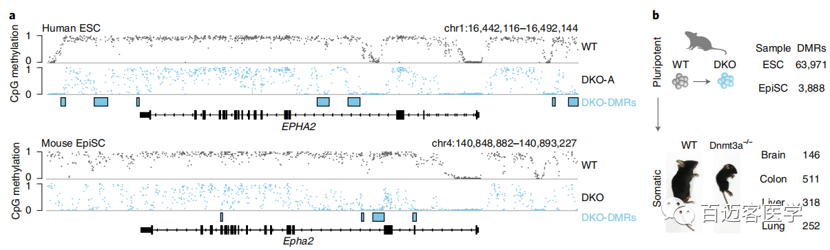 為了探索這種局部調(diào)節(jié)的動態(tài)甲基化的保守性,在小鼠表皮干細(xì)胞(EpiSCs)中突變了Dnmt3a和Dnmt3b,因為它們代表了與人類多能細(xì)胞最接近的發(fā)育和分子類似物。在第4步對WT和DKO細(xì)胞進行了WGBS測序,并鑒定了3888個與人類DKO-DMR具有相似特性的DMR,與82%的推定體細(xì)胞增強子重疊。雖然數(shù)量、√確序列和坐標(biāo)未直接在物種之間map,但小鼠DKO-DMR出現(xiàn)在非常相似的位置且與直系同源基因接近(圖4a)。因此,在體細(xì)胞增強子處甲基化轉(zhuǎn)換的機制和這些區(qū)域的調(diào)控模式都看起來非常保守。