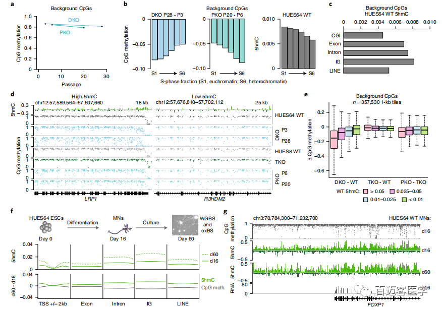 將WT HUES64 ESC分化為有絲分裂后的運動神經(jīng)元,其中5hmC不能通過分裂被動稀釋,以更具體地跟蹤TET的參與度和催化活性。培養(yǎng)60天后,基因(特別是表達(dá)的基因)和基因間基因座內(nèi)富集了5hmC水平,其中*大的增加發(fā)生在惰性染色質(zhì)內(nèi),支持了TET的廣泛氧化(圖5f,g)。因此,TET通過運動神經(jīng)元以及ESC的基因組保持了廣泛氧化甲基胞嘧啶的能力。