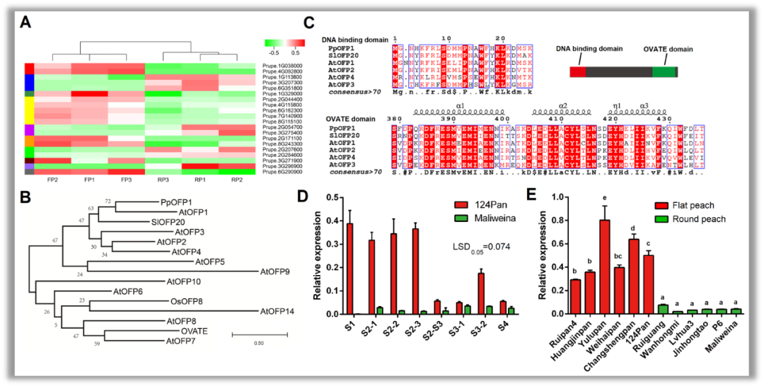 通過比較扁桃和圓桃果實(shí)發(fā)育過程中果實(shí)縱徑和果實(shí)橫徑的變化,發(fā)現(xiàn)在S2時(shí)期兩者果實(shí)增長均較快(圖2),于是作者在S2時(shí)期選擇多個(gè)扁桃和圓桃進(jìn)行轉(zhuǎn)錄組測序,結(jié)果在S位點(diǎn)附近發(fā)現(xiàn)1個(gè)在扁桃中上調(diào)差異表達(dá)基因rupe.6G290900PpOFP1)(圖3A)。PpOFP1AtOFP1SlOFP20為同源基因,2個(gè)基因分別負(fù)調(diào)控?cái)M南芥細(xì)胞伸長以及番茄子房發(fā)育,從而說明PpOFP1很有可能是引起果實(shí)形狀變化的候選基因。在果實(shí)發(fā)育S2期,扁桃果實(shí)中PpOFP1表達(dá)量顯著高于圓桃(圖3D,E),RNA原位雜交也顯示PpOFP1基因在外皮層和內(nèi)皮層細(xì)胞分裂區(qū),該結(jié)果再次證實(shí)PpOFP1在果實(shí)縱向發(fā)育過程中發(fā)揮重要作用。