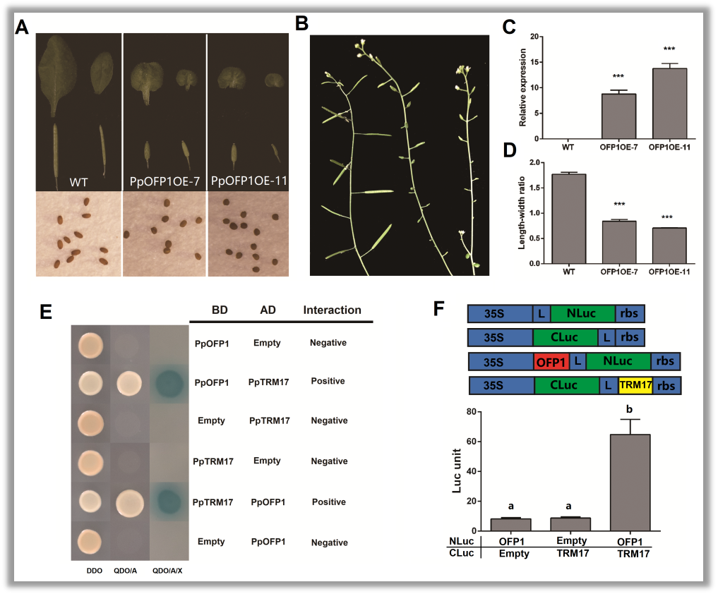 前期研究發(fā)現(xiàn)OFP基因家族與TRM基因家族存在互做來調(diào)控植物器官形狀,于是作者分析了可能與PpOFP1互做的TRM基因,在桃子基因組中篩選到1個(gè)可能的互做基因PpTRM17,通過酵母雙雜(圖4E)和螢火蟲熒光素酶雙分子互補(bǔ)實(shí)驗(yàn)(圖4F),發(fā)現(xiàn)PpOFP1能夠與PpTRM17存在互做關(guān)系。