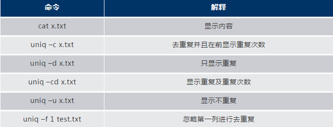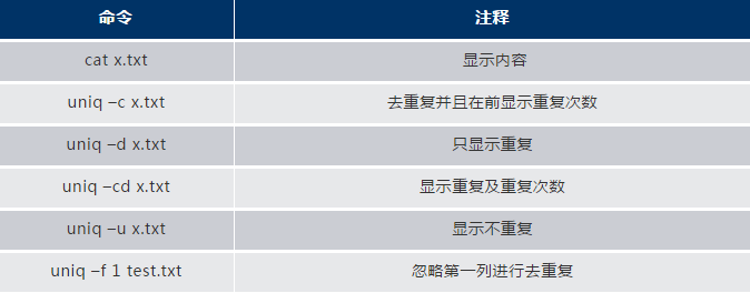 uniq需要配合sort進行使用,把重復(fù)的內(nèi)容排序到一起,以下為最常用的幾個命令實例