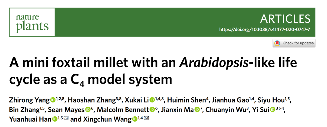 2020年8月31日,山西農(nóng)業(yè)大學雜糧分子育種團隊與中國農(nóng)業(yè)科學院作物科學研究所等單位合作研究論文“A mini-foxtail millet with an Arabidopsis-like life cycle as a C4 model system”在線發(fā)表于國際期刊Nature Plants(IF:13.256),報道了C4禾谷類研究的理想模式植物“小米”的研究成果。山西農(nóng)業(yè)大學的楊致榮教授、中國農(nóng)業(yè)科學院作物科學研究所的張皓珊博士和山西農(nóng)業(yè)大學的李旭凱副教授為論文的共同第一作者;山西農(nóng)業(yè)大學的王興春教授、韓淵懷教授和中國農(nóng)業(yè)科學院作物科學研究所的隋毅副研究員為論文的共同通訊作者。美國普渡大學和英國諾丁漢大學等單位參與了部分研究。百邁客有幸參與了其中基因組、轉錄組及數(shù)據(jù)庫構建工作。目前,數(shù)據(jù)庫由百邁客負責維護和運行,暫時托管在公司服務器(http://foxtail-millet.biocloud.net/home)。