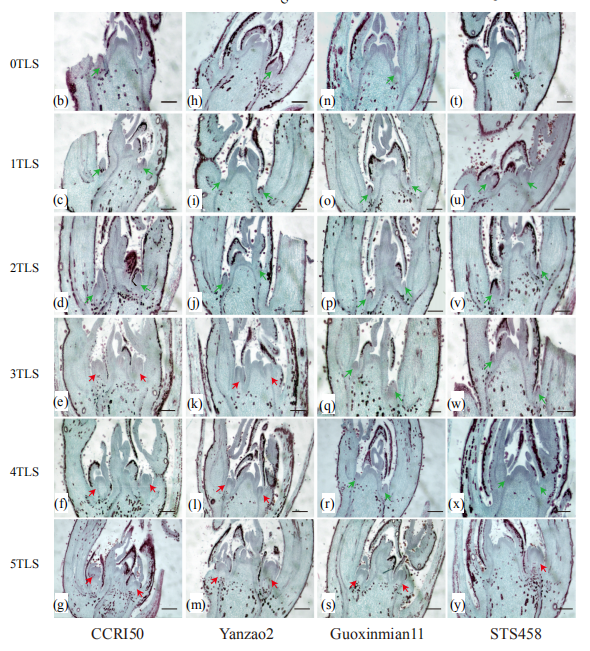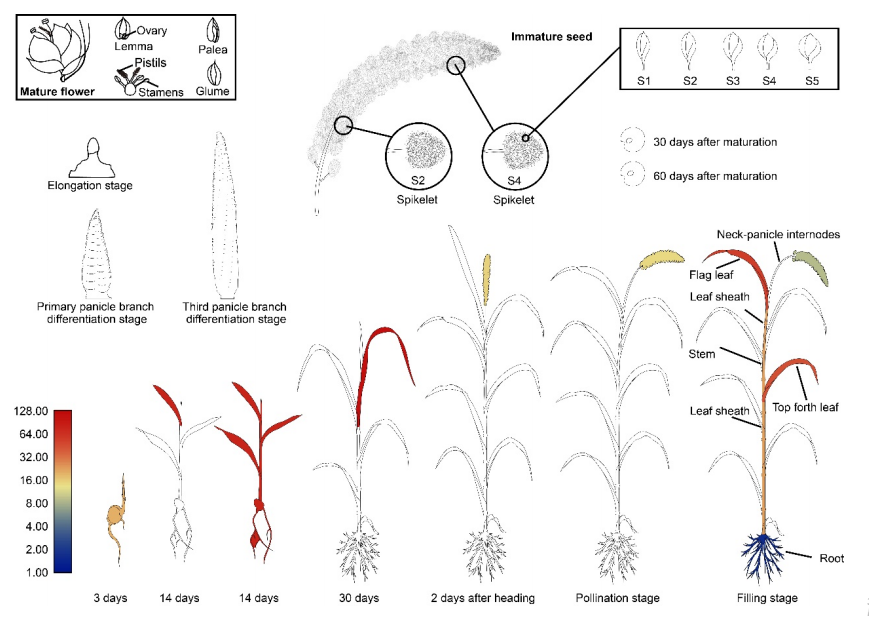 11個不同的組織:3日齡種子(種子)、2周齡整株苗(苗)、根、莖、2周齡苗的第一片全展葉(葉1),30日齡植株頂?shù)诙~(葉2)、旗葉(葉3)、第四葉(葉4)、未成熟的圓錐花序(圓錐花序1)、授粉期圓錐花序(圓錐花序2)、灌漿期圓錐花序(圓錐花序3);葉2有5個生物學重復,其他有3個生物學重復。