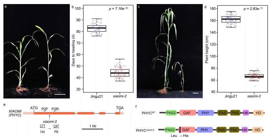 將“小米”基因組序列與經(jīng)基因組重測序生成的晉谷21基因組序列進行比較,發(fā)現(xiàn)在定位區(qū)域只存在一個突變——“小米”基因Si9g09200的編碼區(qū)從“G”到“T”的突變,該基因編碼一種假定的PHYC蛋白(圖2a)。在所檢測的77個早期抽穗F2個體中,均為T/T純合突變體。相比之下,在256個晚抽穗個體中,92個是G/G WT純合子,另外164個是G/T雜合子,反映了基因型和表型之間的完美關聯(lián)。這種突變產(chǎn)生了一個終止密碼子,形成一個截短的蛋白質,占該基因約71%的轉錄本(轉錄本1)(圖2a-d)。這一突變還導致了113 bp的移碼缺失的剪接,形成了占該基因約29%轉錄本(轉錄本2)的截短蛋白(圖2a-d)。根據(jù)預測,被截斷的蛋白質缺少第二個PAS結構域的三分之二(肽1)或三分之一(肽2),以及整個HK和HD域(圖2d)。