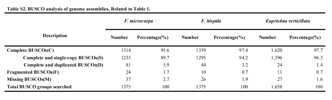 表1 細(xì)葉榕、對(duì)葉榕及榕小蜂基因組組裝及評(píng)估結(jié)果