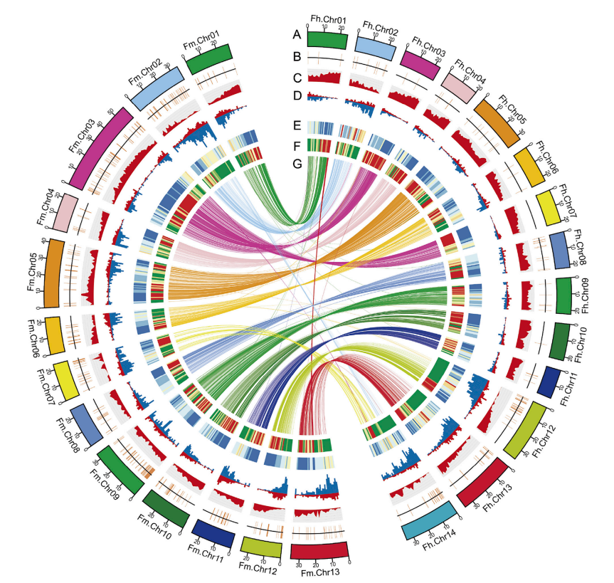 兩種榕樹(shù)基因組比較發(fā)現(xiàn)有大量結(jié)構(gòu)變異,細(xì)葉榕的3號(hào)染色體FmChr03,與對(duì)葉榕3號(hào)及7號(hào)染色體(FhChr03、FhChr07)發(fā)生融合或裂變事件,重排區(qū)內(nèi)的基因富集顯示主要與植物免疫功能有關(guān)。兩種榕樹(shù)在真雙子葉植物的三倍體事件之后,均沒(méi)有檢測(cè)到全基因組復(fù)制(WGD)事件。全基因組比對(duì)分析表明,兩個(gè)榕樹(shù)基因組共有約38Mb 片段重復(fù)(SDs),表明SD是基因組規(guī)模擴(kuò)大的主要因素。