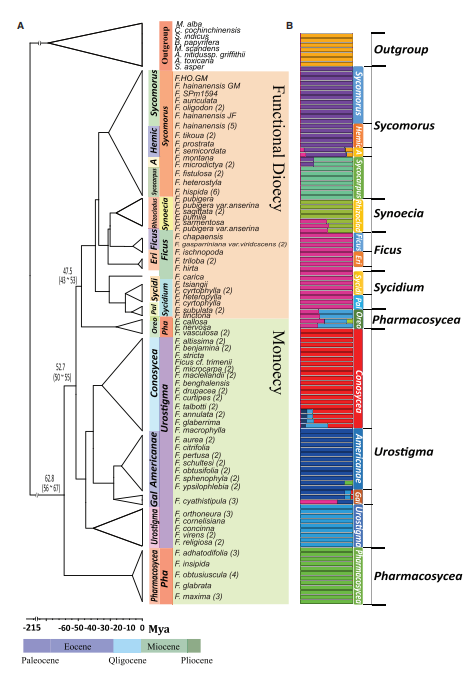 利用112份榕樹(shù)材料的基因組重測(cè)序數(shù)據(jù),建立了榕樹(shù)的系統(tǒng)發(fā)育史,其中包括62種榕樹(shù)屬,包括2個(gè)雌雄同株亞屬(Pharmacosycea, Urostigma)和4個(gè)雌雄異株亞屬(Sycidium,Sycomorus, Synoecia?,Ficus),它們代表了榕樹(shù)的6個(gè)亞屬和主要分支。白肉榕亞屬(Pharmacosycea)被分至兩類(lèi),進(jìn)化樹(shù)、ADMIXTURE、遺傳相關(guān)性分析及ABBA-BABA分析發(fā)現(xiàn)了整個(gè)屬存在潛在廣泛的種間雜交。系統(tǒng)發(fā)育揭示了雌雄同株代表了整個(gè)屬的祖先繁殖系統(tǒng)(圖4)。分化時(shí)間顯示,始新世時(shí)期(約47.5 Mya)出現(xiàn)了雌雄同株和雌雄異株的分化。