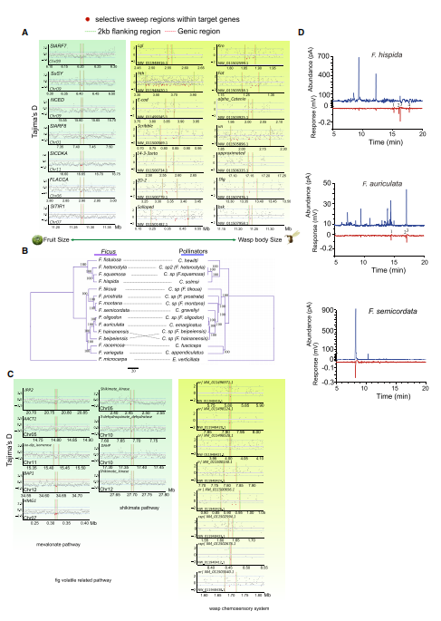 七千五百萬(wàn)年來(lái),榕樹(shù)和榕小蜂之間的專(zhuān)性協(xié)同進(jìn)化在這個(gè)協(xié)同進(jìn)化系統(tǒng)中形成了形態(tài)和生理上的相適應(yīng)。榕樹(shù)在全球和當(dāng)?shù)囟加袠O高的物種多樣性,同域近緣榕果物種間生殖隔離的主要原因是傳粉蜂的特異性。為了探討榕果與傳粉蜂協(xié)同進(jìn)化的潛在分子機(jī)制,作者利用14個(gè)來(lái)自Sycomorus亞屬的榕樹(shù)和其相應(yīng)傳粉蜂的重測(cè)序數(shù)據(jù)進(jìn)行分析。系統(tǒng)發(fā)育分析表明,在這個(gè)分類(lèi)水平上,寄主關(guān)聯(lián)具有很強(qiáng)的保守性,同時(shí)也檢測(cè)到一些寄主轉(zhuǎn)移事件。為了確定在這些協(xié)同進(jìn)化的物種中可能經(jīng)歷了相互選擇和分化的候選基因,作者利用Tajima’D和SweeD分析對(duì)榕果和傳粉蜂基因組進(jìn)行了選擇性清除分析,顯示在榕果和傳粉蜂中生長(zhǎng)相關(guān)的基因、榕果揮發(fā)物相關(guān)基因和傳粉蜂化學(xué)感應(yīng)系統(tǒng)相關(guān)基因受到一定的選擇作用。并通過(guò)榕小蜂對(duì)三種不同榕果釋放揮發(fā)物質(zhì)的電生理測(cè)試,支持了甲羥戊酸和莽草酸途徑在吸引特定傳粉者方面的重要作用(圖5),揭示了在這種專(zhuān)性互利共生中共分化的潛在分子機(jī)制。
